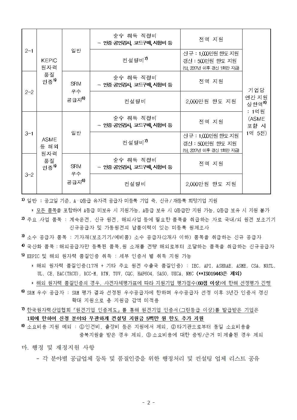 단, 한국원자력산업협회 「원전기업인증제도」를 통해 원전기업 인증서(그린등급 이상)를 발급받은 기업 또는 지원사업 선발 후 협약기간 내 원전기업 인증을 받은 기업은 지원금 신청 시 1회에 한하여 지원금 감액 없이 100% 지급됩니다.