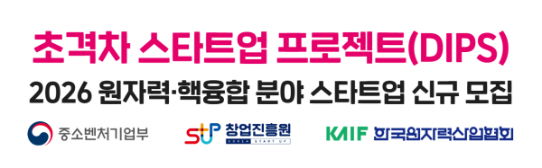 원자력산업협회, 차세대 원전 분야 창업기업 신규지원 2025년 초격차 스타트업 육성사업 기업당 최대 2억원 지원□ 한국원자력산업협회(황주호 회장, 이하 원산협회)는 2024년 5개社* 지원에 이어‘2025년 초격차 스타트업 육성사업(DIPS 1000+)’ 차세대 원전 분야 창업기업 5개社(그린방사선, 삼홍기계, 상림엠에스피, 큐토프, 팹타머)를 추가로 신규 선정하였으며, 선정된 기업은 3년간 사업화 자금 총 6억 원(연간 최대 2억 원)을 지원한다. * 2024년 선정기업 : 딥아이, 라디안, 마이크로우라너스, 엠에스아이랩스, 한국원자력로봇□ 본 사업은 초격차 10대* 분야에 해당하며, 독보적인 기술력을 보유한 10년 이내 창업한 기업을 대상으로 사업화 및 글로벌 진출 등을 지원하는 사업이다. 중소벤처기업부가 총괄하고, 창업진흥원이 전담하며, 분야별 주관기관을 통해 사업을 관리한다. * 10대 분야 : 시스템반도체, 바이오헬스, 미래 모빌리티, 친환경&midd...