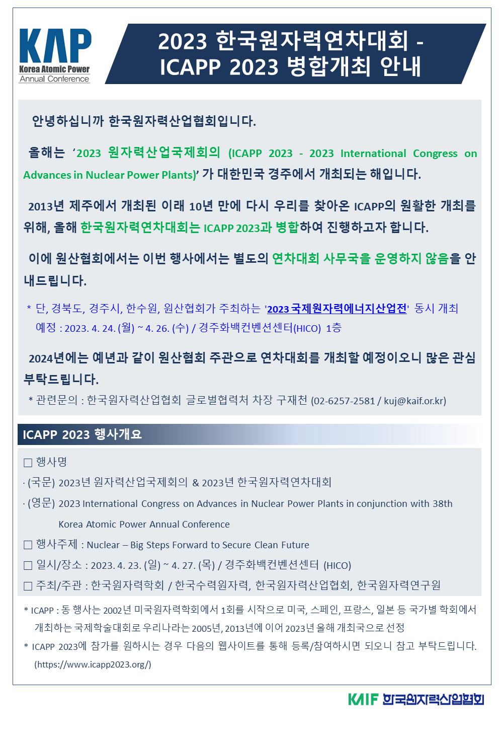 2023 한국원자력연차대회 - ICAPP 2023 병합개최 안내