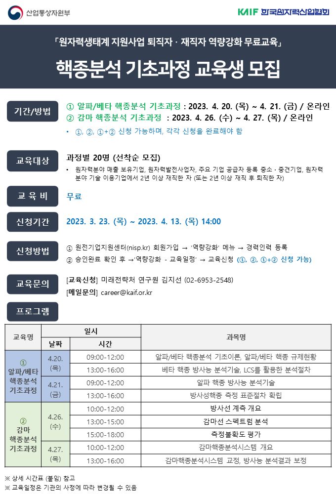 2023 퇴직자·재직자 역량강화 지원사업 - 핵종분석 (알파/베타, 감마) 기초과정 교육생 모집 _마감