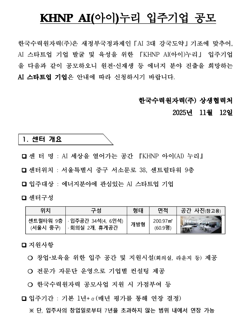 한국수력원자력에서는 서울에 있는 센터에 입주를 희망하는 AI(아이)누리 입주기업을 모집하고 있습니다.