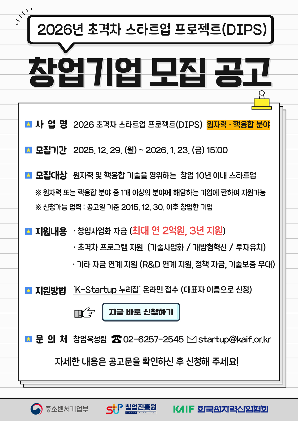 2026년 초격차 스타트업 프로젝트(DIPS) 신규 창업기업 모집 (~1. 23. (금) 15:00)