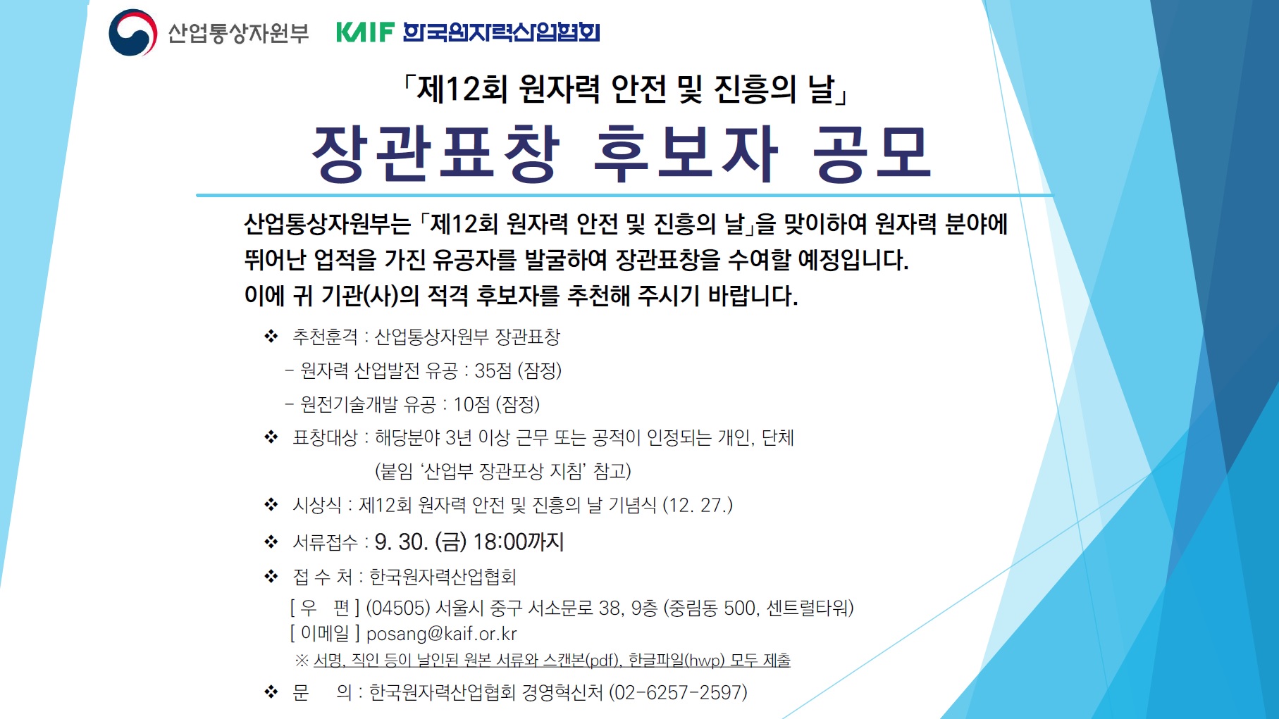 「제12회 원자력 안전 및 진흥의 날」산업통상자원부 장관표창 후보자 공모 (마감)