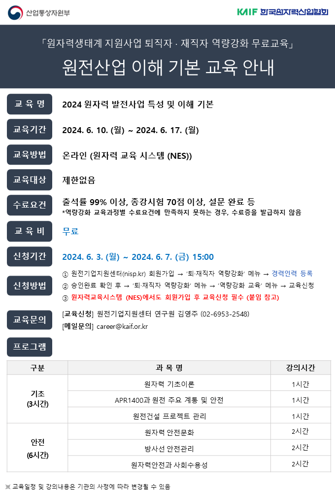 2024 원자력 발전사업 특성 및 이해 기본 (3차) 교육생 모집 (마감)
